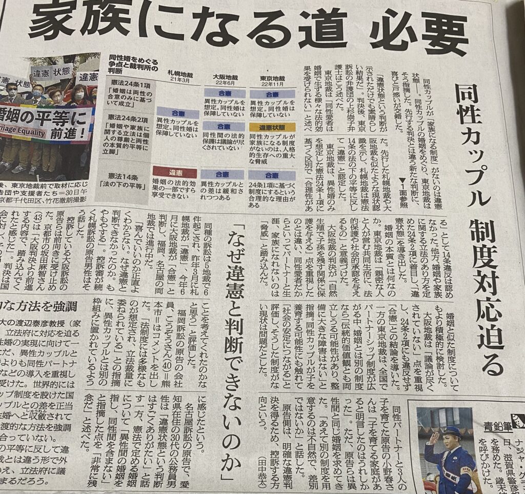 ちなみに、「違憲「合憲」「みんなの意見」とまるでラップバトルかのような判決出まくりに関して言えば、本日の朝日新聞では同性愛カップルに関する記事が掲載されており、現在「違憲と判断できない」状態とのこと。